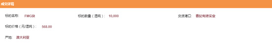 11月21日, 10000吨FMG块以568元/湿吨的价格在平台港口D板块(曹妃甸港)成交,这是FMG直销人民币港口现货在平台的首单成交。