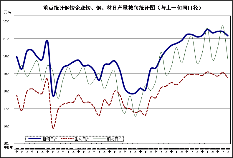本月重点统计钢铁企业累计平均日产粗钢213.66万吨,环比下降0.55%、同比增长6.73%;生铁189.62万吨,环比下降1.08%、同比增长4.82%;钢材199.93万吨,环比下降4.35%、同比增长6.50%。