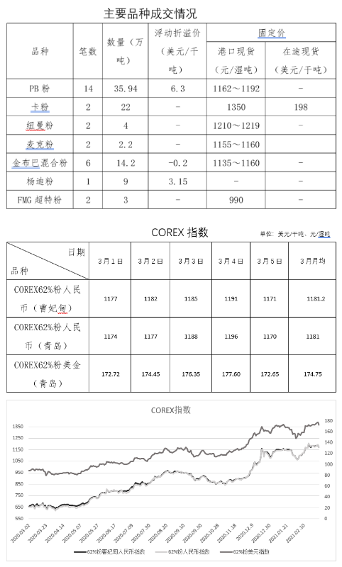 3月1日-3月5日成交47笔共126.14万吨,其中在途6笔64.4万吨,港口41笔61.74万吨。