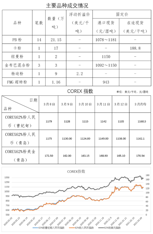 3月8日-3月12日成交34笔共74.11万吨,其中在途2笔26万吨,港口32笔48.11万吨。